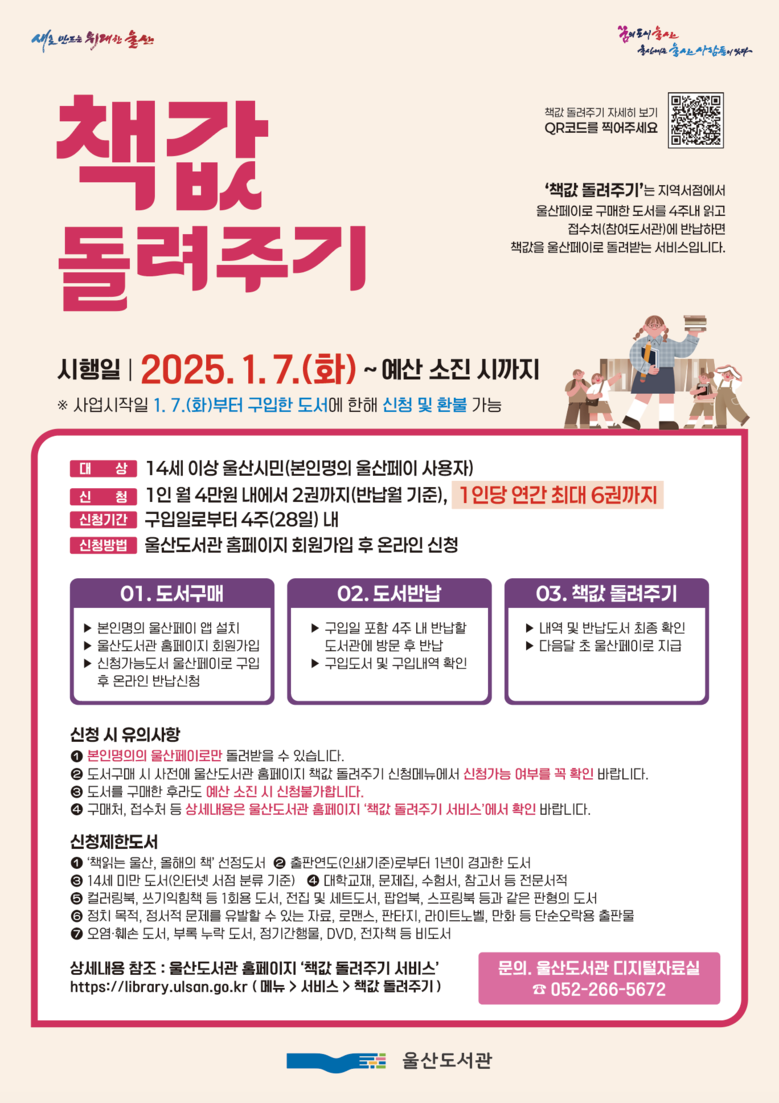 한편 울산페이로 도서 구입 가능한 지역 서점과 사업에 참여 중인 공공도서관 현황 등 자세한 사항은 울산도서관 누리집(https://library.ulsan.go.kr) ‘책값 돌려주기 서비스’를 참고하면 된다.