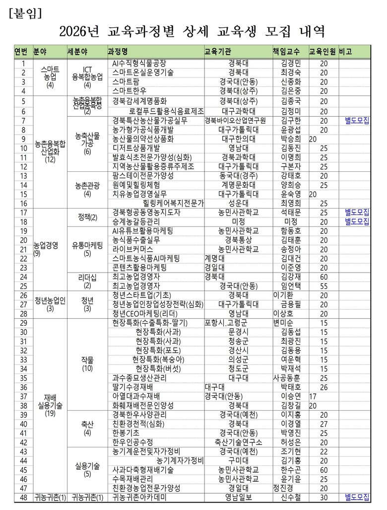 [경북 세계타임즈=한윤석 기자] 경상북도는 이달 12일부터 다음달 6일까지 26일간 2026년도 경북농민사관학교 44개 교육과정에 대하여 1,017명의 교육생을 모집한다.