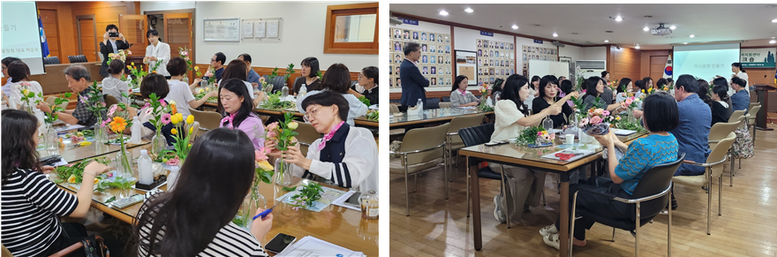 이어진 ‘미니 꽃병 만들기-마음 한다발’프로그램은 감정 노동에 지친 직원들의 마음에 맑은 한 줄기 빛을 선사하는 시간으로 마산센터 현장지원분과 위원이자 마음정원 힐링원예치료센터장이신 백운옥 대표의 후원과 지도 아래,각자 개성 있는 꽃병을 만들며 정서적 안정과 치유의 시간을 가졌다.