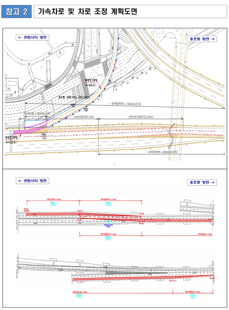 광안대교(용호동→센텀시티 방면) 센텀시티지하차도 진입 약 1.2킬로미터(km) 전방부터 안전지대를 설치하여 차로를 조정한다.