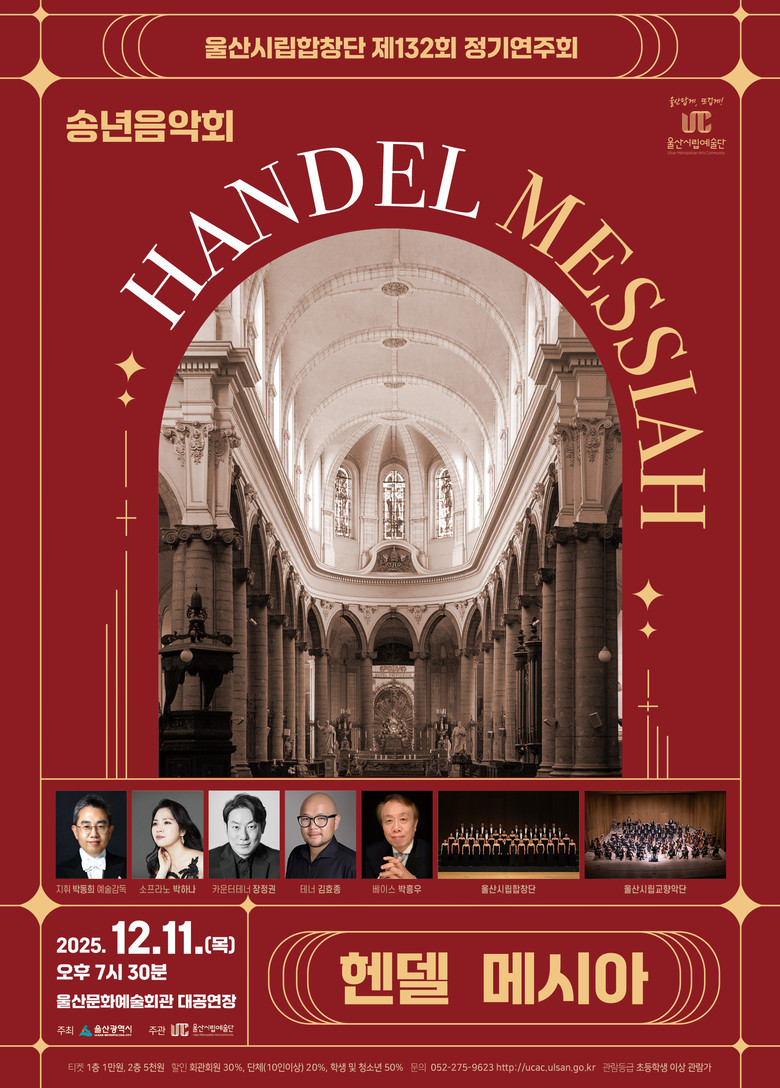 11일 오후 7시 30분, 울산문화예술회관 대공연장 [울신 세계타임즈=이호근 기자] 울산시립합창단이 오는 12월 11일 오후 7시 30분 울산문화예술회관 대공연장에서 제132회 정기연주회로 송년 음악회 헨델(G.F Handel) ‘메시아(Messiah)’를 선보인다.