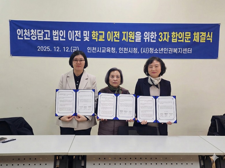 [인천 세계타임즈=심하린 기자] 인천광역시교육청(교육감 도성훈)은 12일 인천시청, 사단법인 청소년인권복지센터 내일과 함께 인천청담고등학교의 법인 이전 및 학교 이전 지원을 위한 3자 합의를 체결했다.