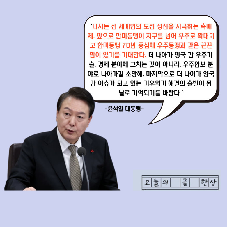 윤 대통령은 NASA방문 연설에서 “앞으로의 한미동맹이 더 나아가 우주로 넓혀지고 이를 통해 새롭고 끈끈한 한미동맹 70년 중심에 우주동맹이 있기를 기대한다.”고 말하며 우주동맹이라는 단어를 강조했다.