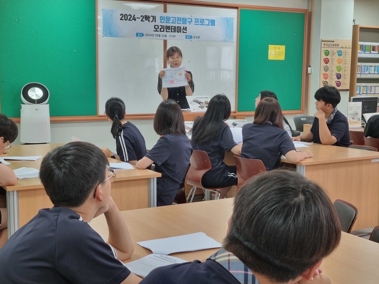 고전읽기를 통한 주도성 함양을 목표로하는 인문고전탐구 프로그램은 아침 수업 시작 전 1시간을 활용하여 15회 운영되며 고전을 통한 주제 및 진로 탐구형 학생주도 도서관 프로그램이다. 프로그램을 마친 학생들은 활동 에세이를 작성 제출하고 인증서를 받게 되는데, 매년 참여한 학생들의 만족도가 높고, 성취욕 자극과 자존감 향상에 매우 긍정적인 프로그램으로 평가된다. 지난 1학기(2학년 대상)에 이어 이번 2학기에는 1학년 20명의 학생들이 참가하고 있다.