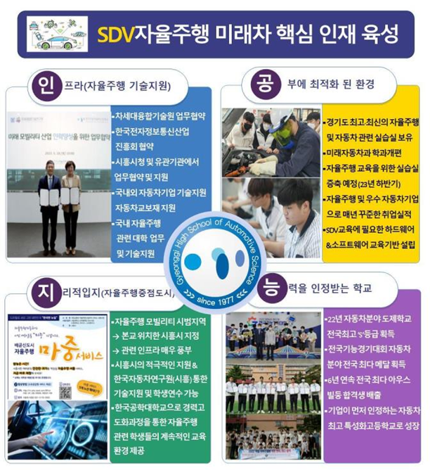 “PLUG IN THE FUTURE”의 슬로건아래 자동차 전공 최다 학생, 최신의 실습장과 최다 기자재 보유, 아우스 빌둥 최다 합격, 중기청인력양성우수사업교, 산학일체형도제학교 S등급 등 자동차 분야 최우수를 걸어온 경기자동차과학고등학교는 자동차 교육의 상향 평준화를 주도하였다. 전혜현 교장은 ‘SDV 기반 자율주행 미래차 핵심 인재 육성의 마이크로 교육과정을 성공적으로 이뤄 대한민국의 미래자동차 교육의 자부심이 되겠다’고 말했다.