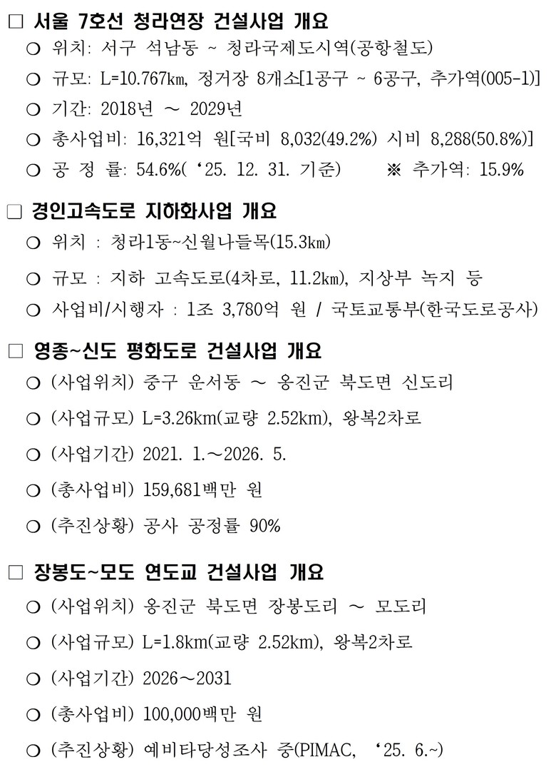 해상과 섬 지역을 잇는 도로망 개선도 속도를 낸다. 영종~신도 평화도로와 장봉도 연도교 접속도로 추진으로 섬 지역의 교통 여건은 근본적으로 달라진다.