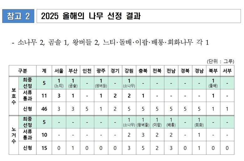 전국적으로 [보호수 분야] ▲강원 영월 소나무 ▲광주 서구 왕버들 ▲서울 송파 느티나무 ▲강원 인제 돌배나무 ▲부산 기장 곰솔이 선정됐고, [노거수 분야] ▲경남 산청 회화나무 ▲강원 정선 소나무 ▲전북 고창 이팝나무 ▲충북 보은 왕버들 ▲전남 진도 배롱나무가 최종 선정됐다.
