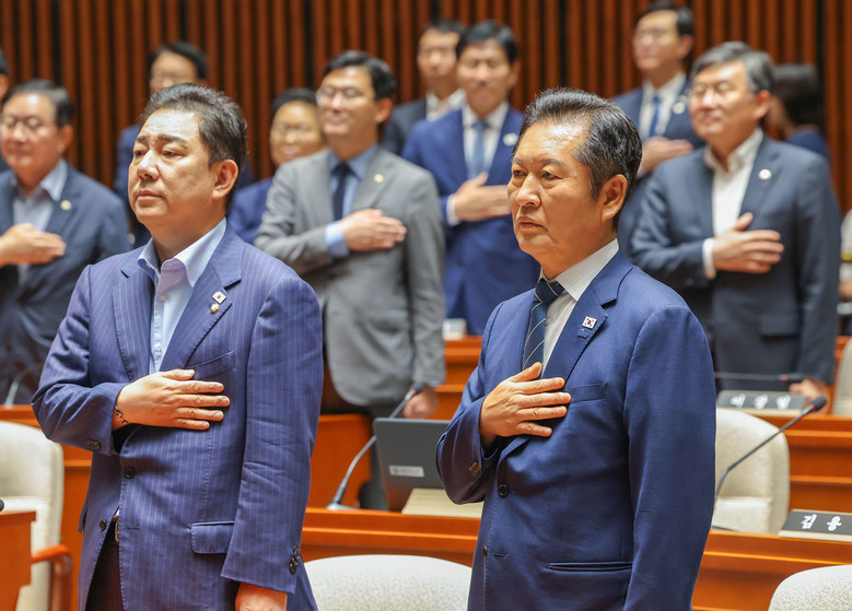 더불어민주당 정청래 대표(오른쪽)와 김병기 원내대표가 21일 국회에서 쟁점법안 처리를 위한 8월 임시국회 본회의 개회를 앞두고 가진 의원총회에서 국기에 경례하고 있다. 2025.8.21