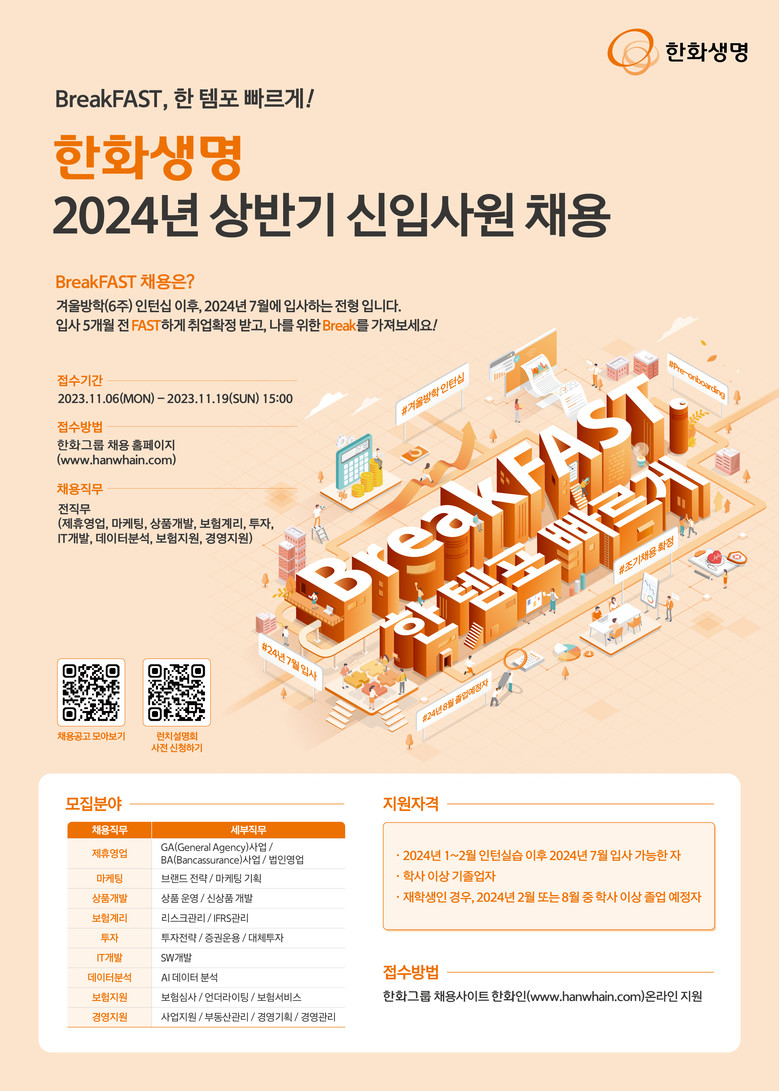 [세계타임즈 = 이송원 기자] 한화생명이 6일(월)부터 19일(일)까지 2024년 신입사원을 모집한다.