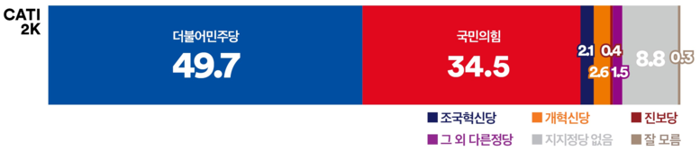 ‘여론조사꽃’ 정당 지지도: 민주 49.7%(1.7%p↑) vs 국힘 34.5%(3.2%p↑) vs 조국 2.1%(0.9%p↓)