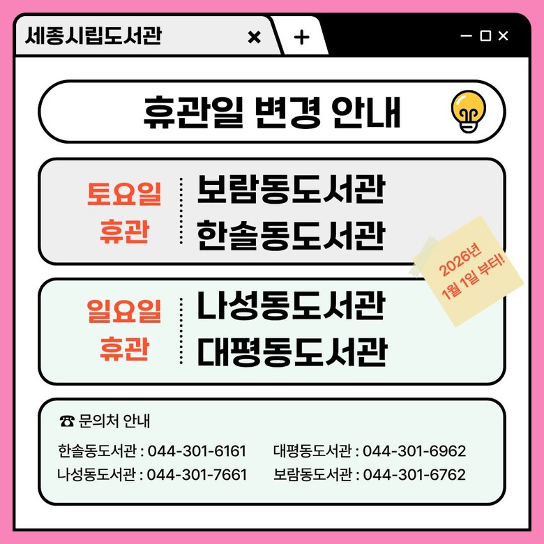 이에 따라 2026년 1월 1일부터 나성동도서관과 대평동도서관은 토요일에서 일요일로, 보람동도서관과 한솔동도서관은 일요일에서 토요일로 휴관일이 조정된다.