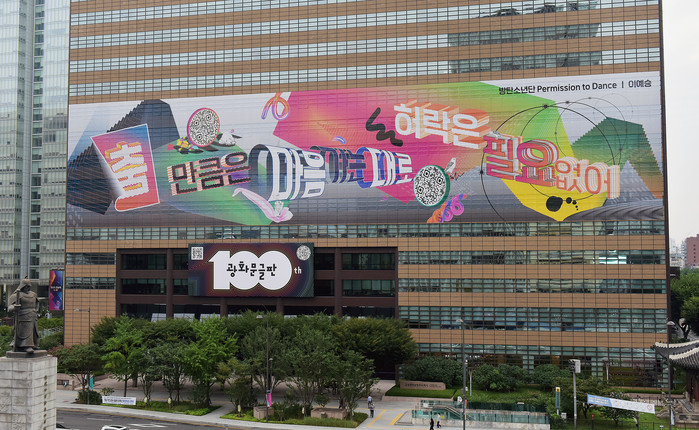 100번째 광화문글판에는 기존 글판의 문법과 형식을 넘어선 ‘즐거운 파격’이 담겼다.‘[ 춤 ]만큼은 마음 가는 대로, 허락은 필요 없어’글로벌 아티스트 방탄소년단이 100번째 광화문글판을 위해 문안을 썼다.