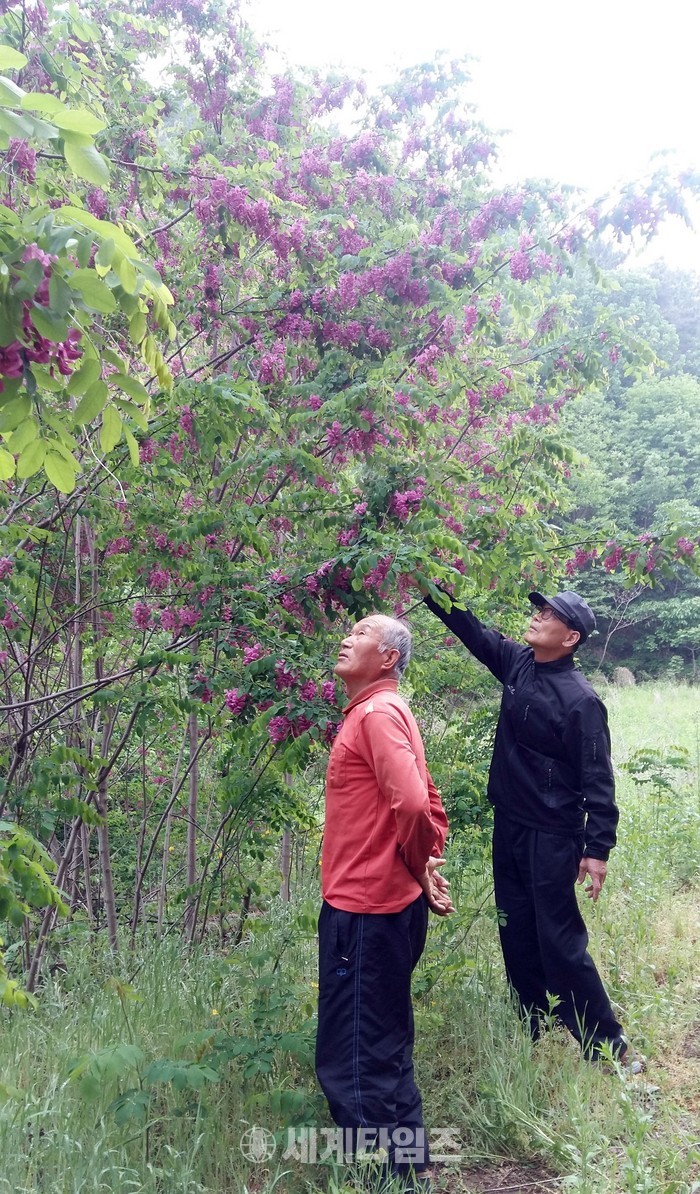 [옥천=세계타임즈 이현진 기자] 대청호가 지척인 충북 옥천군 군북면 대정리 와정마을 뒷산에 분홍색 아카시아 꽃이 만개해 눈길을 끌고 있다.