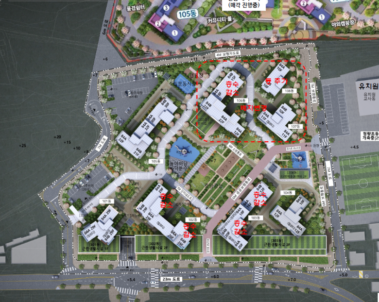 이곳은 지난해 11월 개최된 제7회 건축주택공동위원회에서 635세대로 조건부 통과된 사업이다. 다만 사업부지 북측의 청량초등학교 증·개축공사 중 학교 시설배치가 변경됨에 따라 법적 기준 검토 과정에서 일부 동의 층수 감소 및 1개동 추가 등으로 4세대 감소한 631세대로 계획이 변경됐다.