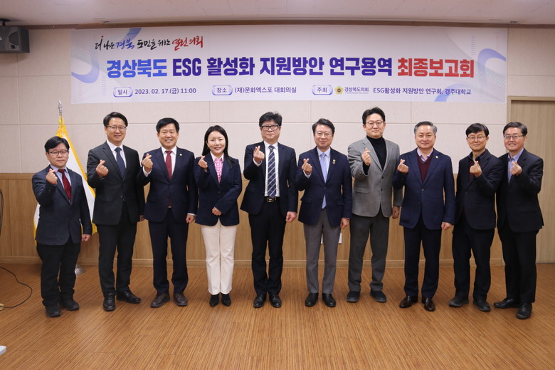 [경북 세계타임즈=한성국 기자] 경북도의회 「경상북도 ESG활성화 지원방안연구회」(대표 연규식 의원, 포항)는 17일 (재)문화엑스포 대회의실에서 「경상북도 ESG활성화 지원방안 연구용역」 최종보고회를 개최했다.