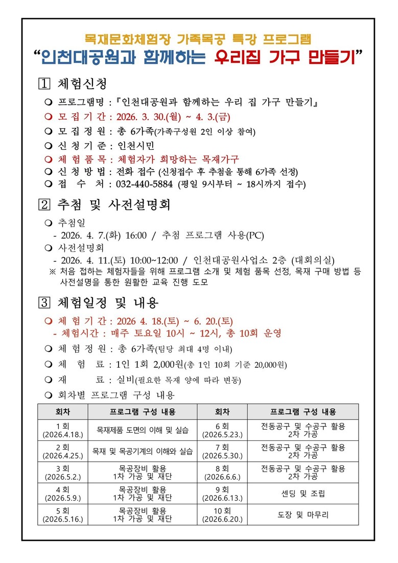 - 4월 18일부터 매주 토요일 10주 과정…3월 30일부터 전화접수 - [인천 세계타임즈=심하린 기자] 인천광역시(시장 유정복) 인천대공원사업소는 가족이 함께 참여해 실생활에 필요한 목재가구를 직접 제작하는 ‘인천대공원과 함께하는 우리집 가구만들기’ 프로그램을 운영한다고 밝혔다.