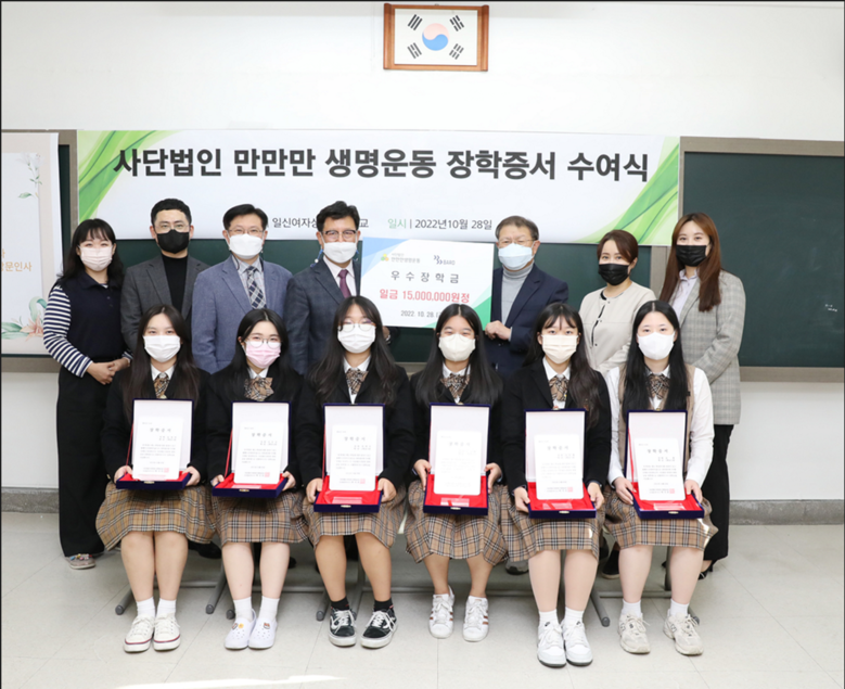 [세계타임즈 백진욱 기자] 지난 10월 28일(금) 서울 일신여자상업고등학교(교장 유일상)가 재학생을 대상으로 『2022 만만만생명운동 장학금 수여식』을 일신여상 학부모회의실에서 실시했다.