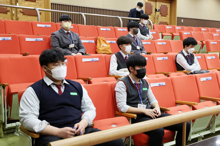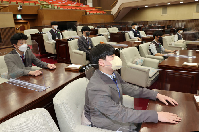 이날 청석고등학교(교장 박종열) 학생 8명은 충북도의회 제398회 임시회 2차 본회의를 방청한 후 의장·의원석에 직접 앉아 본회의를 진행했다. 학생들은 자가검사키트 확인, 열 체크, 사회적 거리두기로 인한 최소인원 참석, 거리두기를 위해 칸막이 설치 등 방역수칙을 준수하며 의정체험학습을 진행했다.