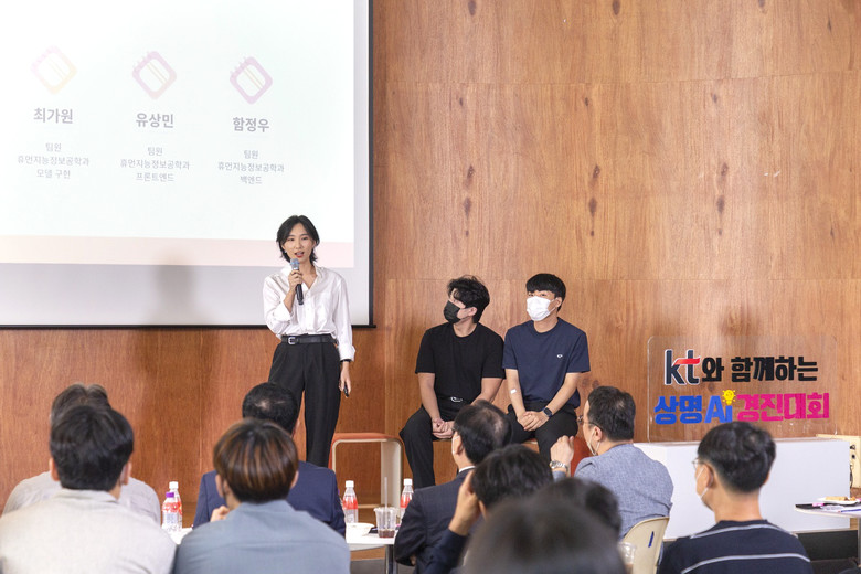 KT와 상명대는 지난 5월 본 경진대회의 예선에서 학부생들의 ‘경제·사회 문제 해결을 위한 AI 활용’ 아이디어를 심사해 본선 진출 팀을 선발했다. 이후 3개월 간 멘토링과 구체화 과정을 마무리한 총 7개 팀이 최종 결선에서 우열을 겨뤘다.
