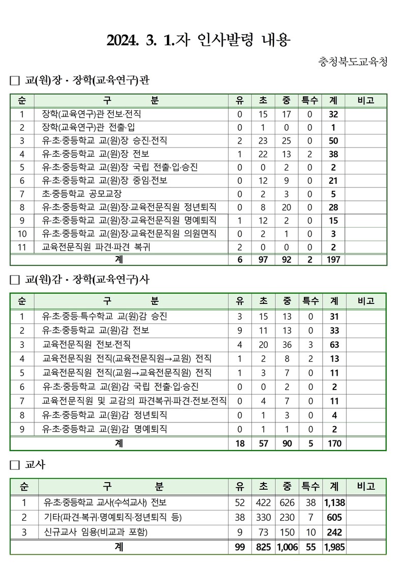 [인사] 충북교육청, 2024. 3. 1.자 교(원)장.교(원)감.교사.교육전문직원 인사