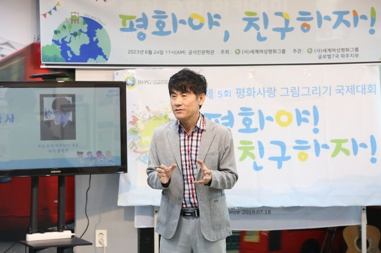 ▲최재순 지부장이 ‘제5회 평화사랑 그림그리기 국제대회 파주지부 예선 시상식’에서 축하를 하고 있다.