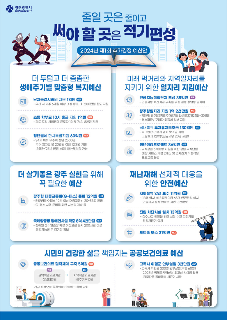 - 촘촘한 복지·일자리·안전 등 ‘더 좋은 광주’ 실현 예산 반영 [광주 세계타임즈=손권일 기자] 광주광역시(시장 강기정)는 2024년도 제1회 추가경정예산안 8727억원을 편성해 18일 광주광역시의회에 제출했다.
