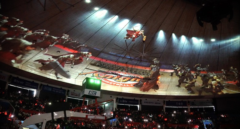 서울SK나이츠 농구단이 갑옷 입고 전투하는 오프닝 영상에 홈 개막전 만원관중 열광