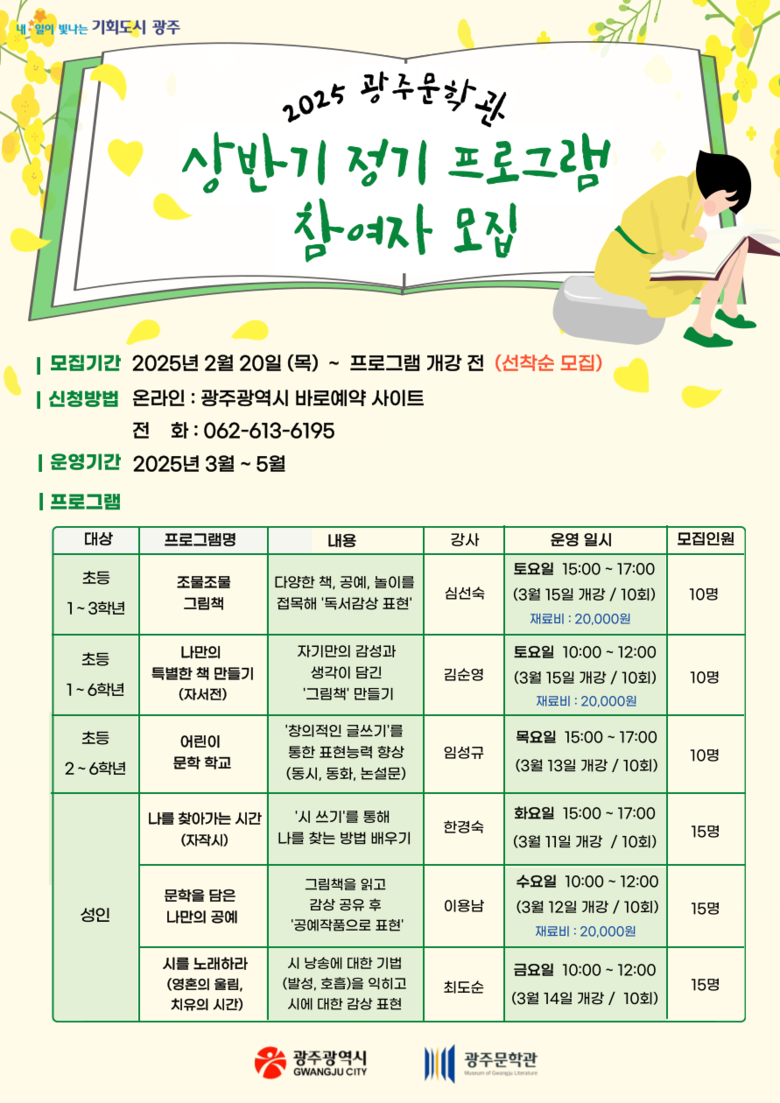 수강 신청은 광주시 누리집 바로예약(https://www.gwangju.go.kr/reserve/)이나 광주문학관(062-613-6195)으로 신청하면 된다. 자세한 내용은 광주문학관 누리집(https://www.gwangju.go.kr/gjlm/)에서 확인할 수 있다.