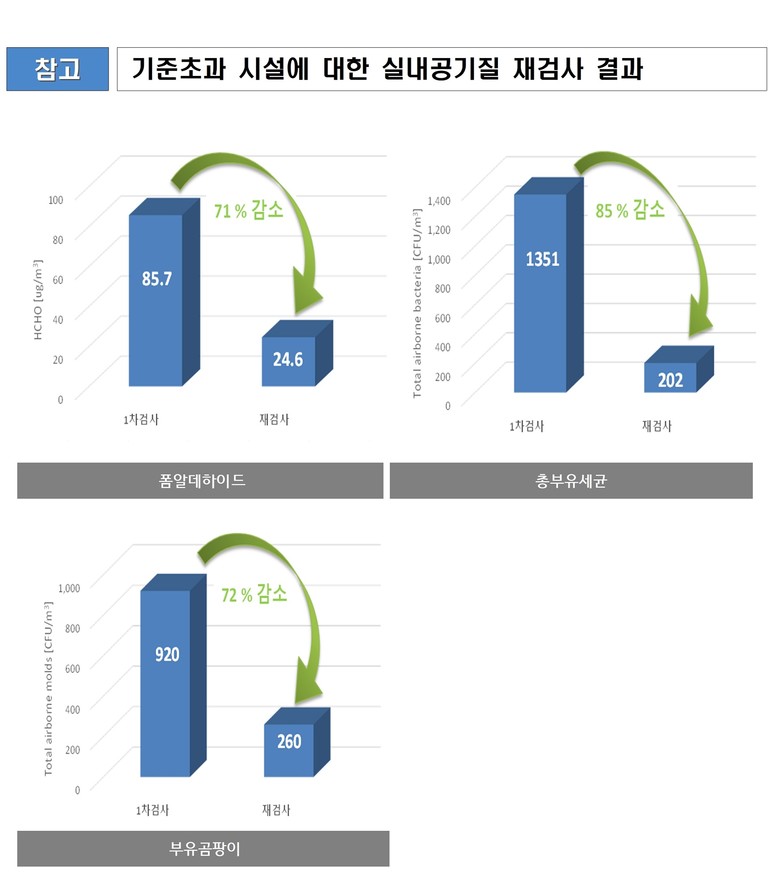 기준 초과 19개 시설에 대해서는 「실내 공기질 관리요령」 안내 책자를 이용한 현장 교육을 통해 자율적 실내 공기질 관리를 유도한 후 재검사를 한 결과, 모두 기준 이내로 안전하게 개선된 것으로 나타났다.