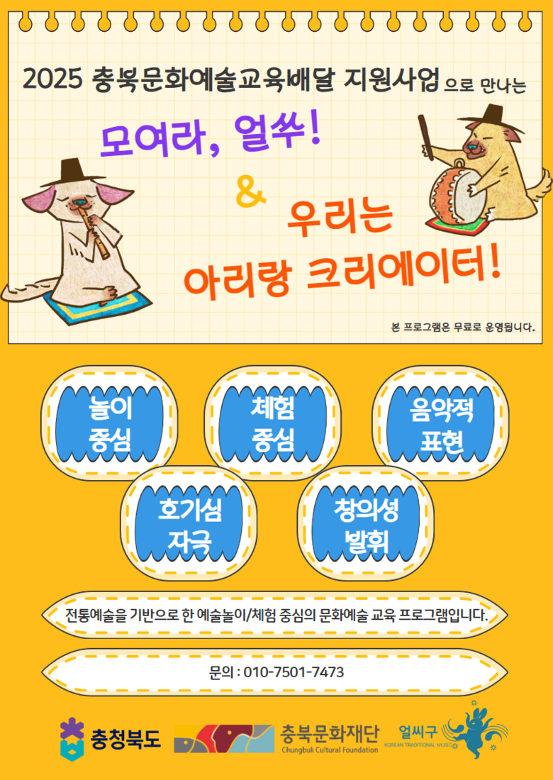 [충북 세계타임즈=이현진 기자] (재)충북문화재단(대표이사 김갑수)과 충북문화예술교육지원센터가 주최·주관하는 ‘2025년 문화예술교육 배달지원사업’ 선정 단체인 ‘얼씨구’가 충북 괴산군에서 아동·청소년들을 위한 전통예술 문화예술교육 프로그램을 진행하며 큰 호응을 얻고 있다.