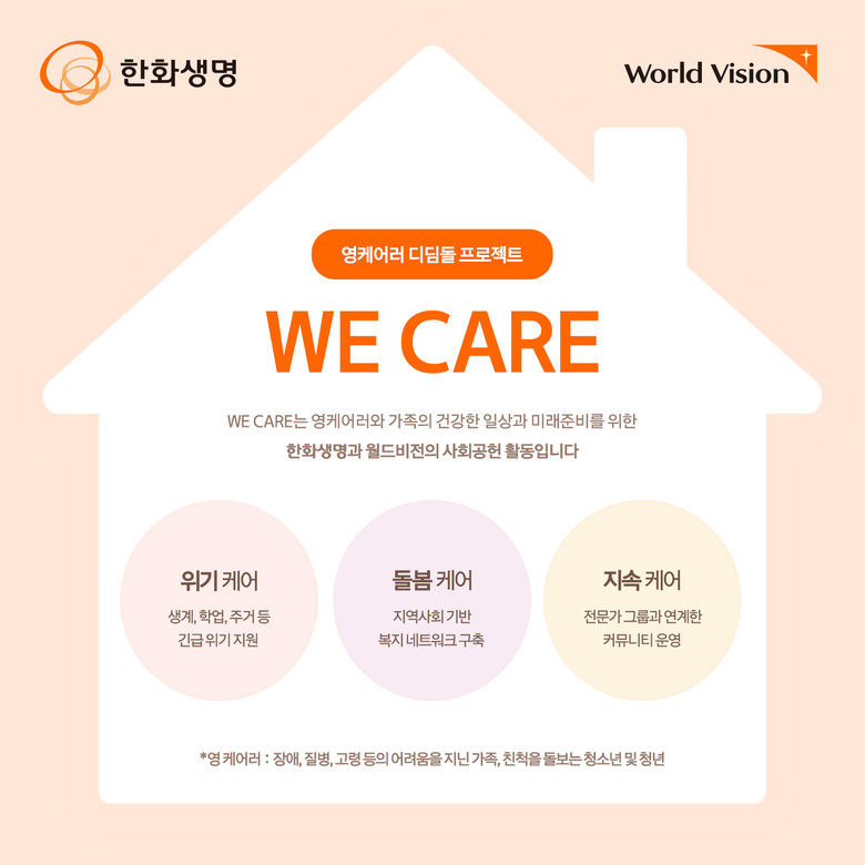 [세계타임즈 = 이송원 기자] 한화생명이 아픈 가족을 돌보며 생계까지 책임지는 ‘가족돌봄청년’을 위한 「영케어러 디딤돌 프로젝트 ‘WE CARE’」를 진행한다.