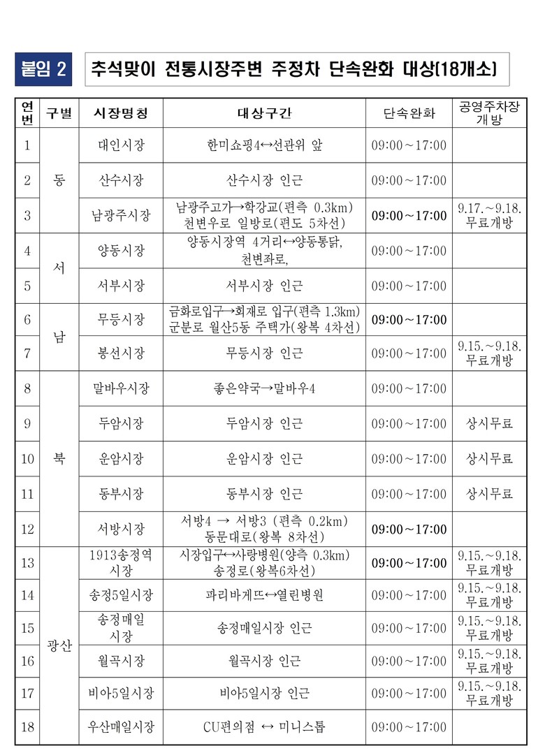 오는 15일부터 18일까지는 무등시장, 1913송정역시장, 송정5일시장, 송정매일시장, 월곡시장, 비아5일시장 등 10개 전통시장 주차장과 300여개 공공기관, 공영주차장을 무료 개방한다.