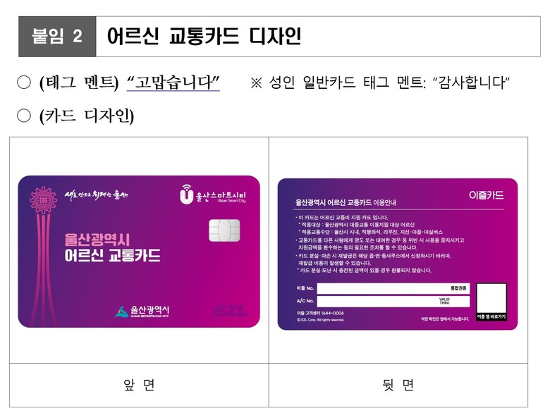울산시는 “도시철도가 있는 타 시도에 비해 상대적으로 교통복지혜택이 적었던 우리 시 어르신들의 교통비 부담을 덜어드리고 버스 이용률도 높일 수 있는 기회가 되도록 사업추진에 만전을 기하겠다”라고 밝혔다.