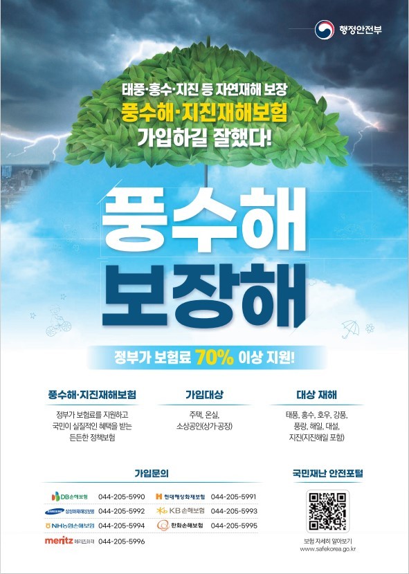 정부와 지자체는 저렴한 보험료로 풍수해 및 지진 피해를 보상받을 수 있도록 최소 70%, 지자체 재정적 여건에 따라 최대 92%까지 지원한다.