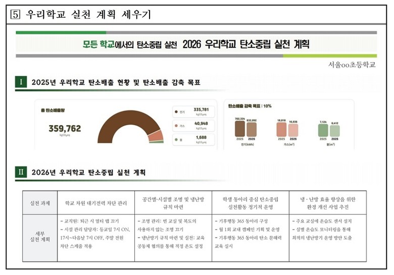 특히 2026년에는‘학교 탄소중립 실천 자가진단 도구’(http://netzero.sen.go.kr)를 새롭게 도입한다. 모든 학교는 이 도구를 활용해 에너지 사용 등 학교의 탄소중립 실천 현황을 점검하고, 그 결과를 바탕으로 학생‧교직원 등 학교 교육공동체가 함께 논의하여 ‘우리학교 실천 과제’를 선정해 연중 실천하게 된다. 서울시교육청은 이를 지원하기 위해 자가진단 도구와 함께 실천 안내서를 모든 학교에 제공할 예정이다.