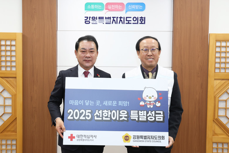 [강원도 세계타임즈=김민석 기자] 강원특별자치도의회(의장 김시성)는 12월 13일(금) 09시 도의회 의장실에서 크리스마스 씰 증정식과 특별회비 전달식을 개최했다.
