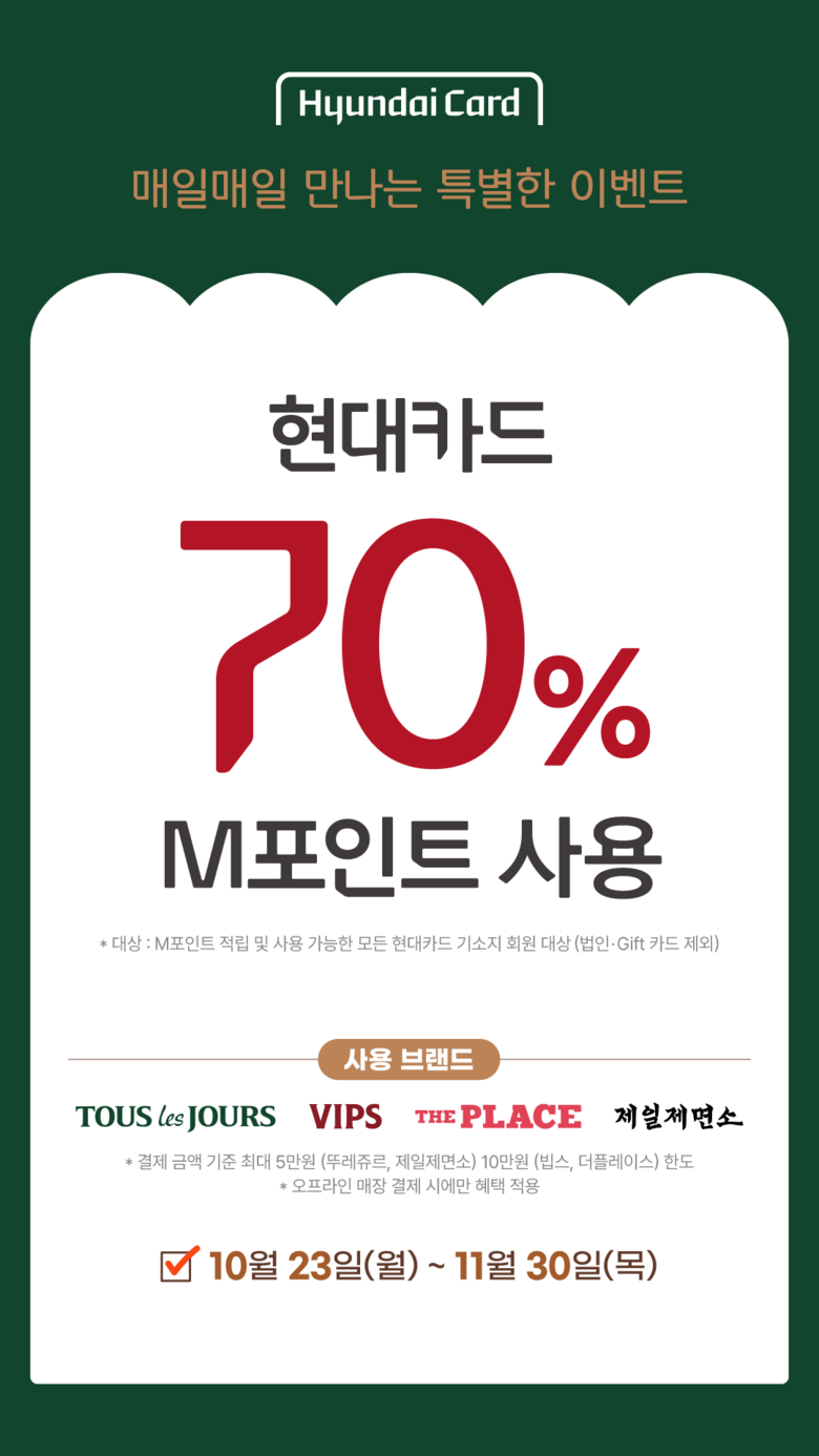 현대카드 ‘M70 프로모션’은 23일부터11월 30일까지 진행된다. M포인트 적립 및 사용 가능한 현대카드 기소지 회원이라면 누구나 참여 가능하다. 뚜레쥬르와 제일제면소는 1회 결제 금액 기준 5만 원(최대 사용 35,000 M포인트), 빕스와 더플레이스는 10만 원(최대 사용 70,000 M포인트) 한도 내에서 매일 사용 가능하다.