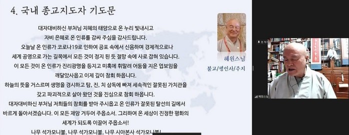 기도회에는 각국에서 다양한 종교인들이 참여했다. 각 종교 형식에 맞게 기도를 하되, 코로나19를 위해 동일한 시간에 기도를 드리기로 하고 각자의 처소에서 기도를 진행했다.