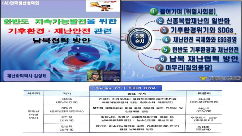 김성제 교수는 Korea SDGs Forum 회원으로서 한반도의 지속가능한 발전(SDGs)을 위해서는 굳건한 안보를 바탕으로 평화통일이 절대적으로 필요하며 북한의 급변사태에 대비해야 한다고 강조했다. 21세기 기후환경위기의 시대 정치경제적인 남북교류가 단절된 가운데 백두산 화산폭발의 가능성과 자연재난(위험)의 복합재난(Natural hazards triggering Technological disasters)으로 전화(轉化)되는 UNDRR(유엔재난위험경감사무국)의 연구결과와 연계해 학술적인 이론을 전개했다.
