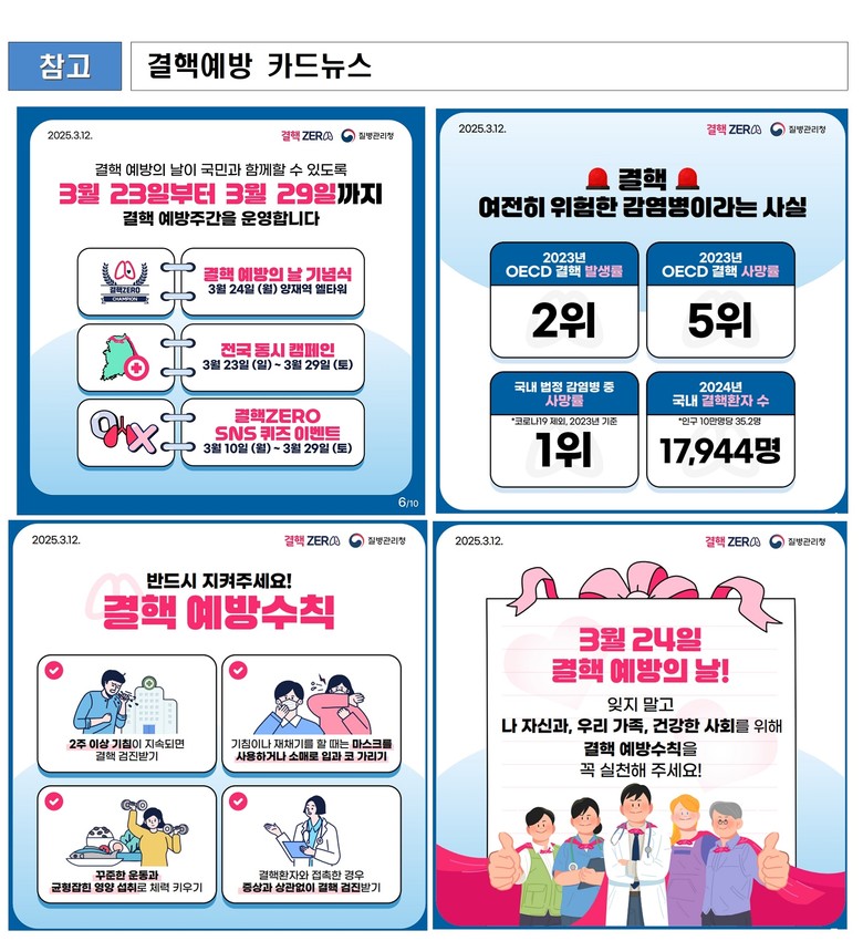결핵 예방의 날(3월 24일)은 결핵 예방의 중요성을 알리고 경각심을 고취하기 위해 제정됐으며, 국가와 지자체는 결핵예방주간(3월 23일~29일)을 운영해 지역주민에게 결핵의 위험성을 알리고 발병률을 낮추기 위한 홍보활동을 추진하고 있다.