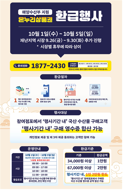 행사와 관련한 자세한 사항은 환급행사 고객센터(☎ 1877-2430, (사)한국수산회)로 문의하거나, 대한민국 수산대전 공식 누리집(www.fsale.kr)을 참조하면 된다.