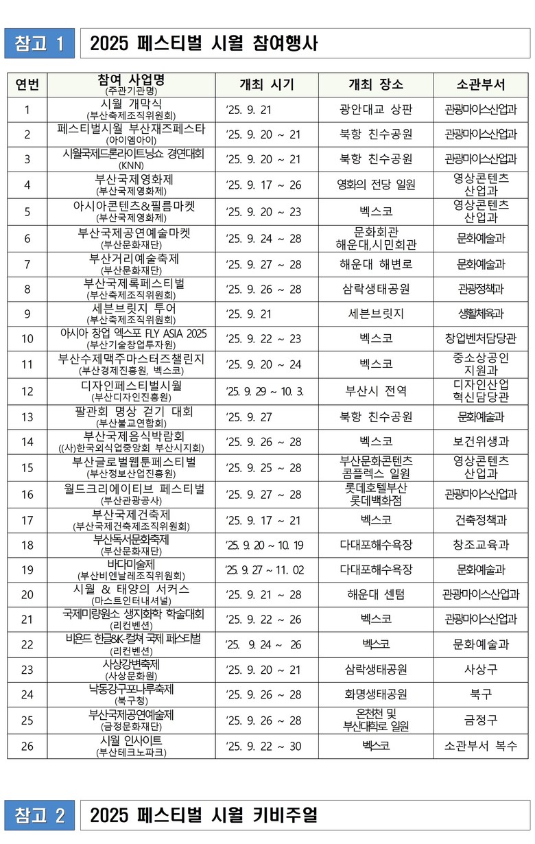 이와 함께, 축제 기간 벡스코에서는 ▲아시아 창업엑스포 '플라이아시아(FLY ASIA) 2025' ▲시민과 관광객을 위한 '부산국제음식박람회'와 '수제맥주마스터스챌린지' ▲아이디어와 지식 교류를 통한 도시의 해답을 찾아가는 '시월 인사이트' 등이 열린다.