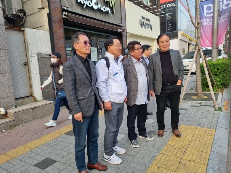 ▲부산 길거리를 돌아다니며 얘기를 나누는 이종현 총회장과 환경관리사원들
