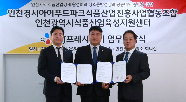 [세계타임즈 = 이현진 기자] CJ프레시웨이가 지난 25일 ‘인천경서 아이푸드파크 식품산업진흥사업 협동조합’(이하 아이푸드파크), ‘인천시 식품산업 육성지원센터’와 3자 업무협약(MOU)을 맺고 인천 지역 식품산업 육성 지원을 위해 상호 협력하기로 했다. 아이푸드파크는 인천시 서구에 위치한 수도권 최대 규모의 식품산업단지다.