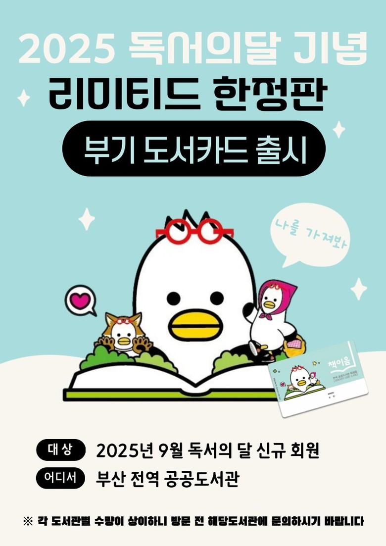 이번 행사는 부산 시민의 도서관 이용 활성화와 독서문화 진흥을 목적으로 마련되었으며, 도서관 신규회원 가입 시 ‘부기’ 캐릭터가 디자인된 도서 카드를 제공해 더욱 친근하고 즐거운 독서 경험을 지원한다.