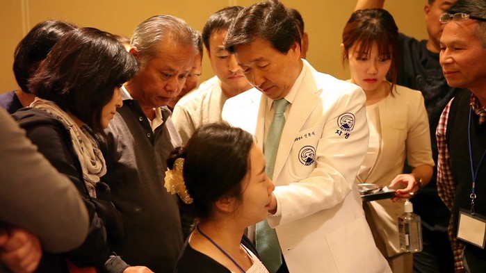 | ▲자생의료재단 신준식 명예이사장이 경추 질환을 앓고 있는 한의사에게 침치료를 실시하고 있다. |