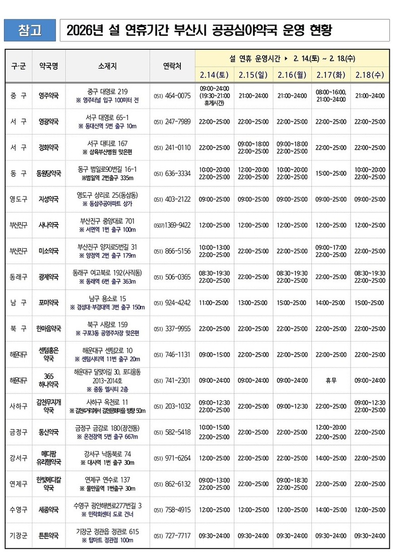 설 연휴 공공심야약국 운영 현황은 우리 시 누리집 ‘2026 설 연휴 생활정보 안내’(busan.go.kr/holiday)에서 확인할 수 있으며, 약국 위치 및 실시간 운영 정보는 응급의료포털(www.e-gen.or.kr)을 통해 확인할 수 있다.