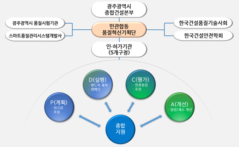 광주시종합건설본부는 그동안 건설공사 품질관리 문제로 막대한 경제적‧사회적 손실이 발생하고 있지만 건설사, 품질시험기관, 인‧허가기관, 발주청 등이 품질관리에 대한 문제와 개선 방안에 대해 논의하고 소통할 수 있는 전담기구가 없었다는 점에 주목, ‘품질혁신기획단’을 구상하게 됐다.