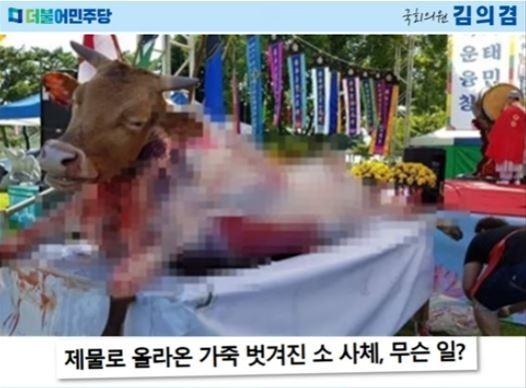 살아있는 소의 가죽을 벗겨 제물로 바친 엽기 굿판이 2018년 9월 9일 충주시 중앙탑에서 살아있는 소의 가죽을 벗겨서 굿을 하는 행사가 벌어져 사회적으로 큰 논란이 벌어졌다.