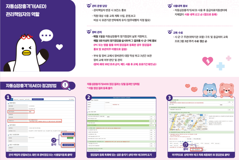 개정된 법과 시행령 시행에 따라 자동심장충격기(AED) 점검·표지판 부착 등 관리 의무사항을 이행하지 않을 경우, 과태료가 부과된다.